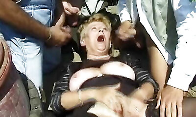 Wild German lady gets fucked by three rigid and loaded cocks outdoors