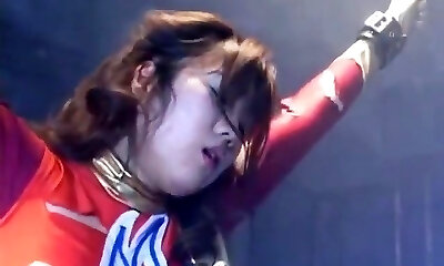 Hollie Stevens in polka-dot dress gets pummeled on the retro car bondage mask