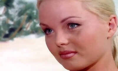 Sizzling blondie in sexy lingerie and stockings swallows cum and drains